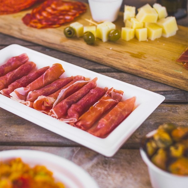 Stylish rectangular plate. Great for hot or cold, and sturdy enough to load up with food. Our moulded fibre uses reclaimed natural materials such as sugarcane, bamboo or wood pulp. Sleek white. Award-winning quality by Vegware, made from plants. Made from recyclable materials.