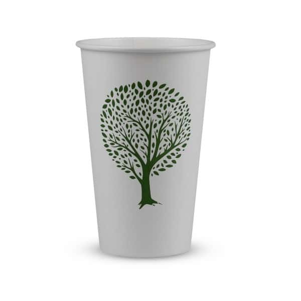 A home compostable 16oz single wall hot cup in our revamped Green Tree design!For coffee, tea and all hot drinks, or soup to go.Sustainably-sourced board, lined with a water based lining. Crisp white board with tree in Vegware green. Award-winning quality, made from plants. Designed for home or industrial composting, recyclable in coffee cup recycling schemes – check your local options.