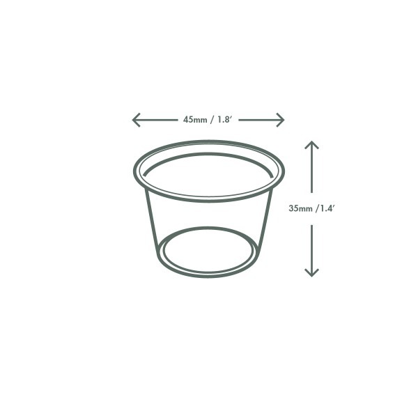 A cute little portion pot. For cold dressings, sauces, juice shots, or sampling. Made from PLA, a renewable material made from plants. Clear for visibility. Award-winning quality by Vegware, made from plants. Commercially compostable where accepted.