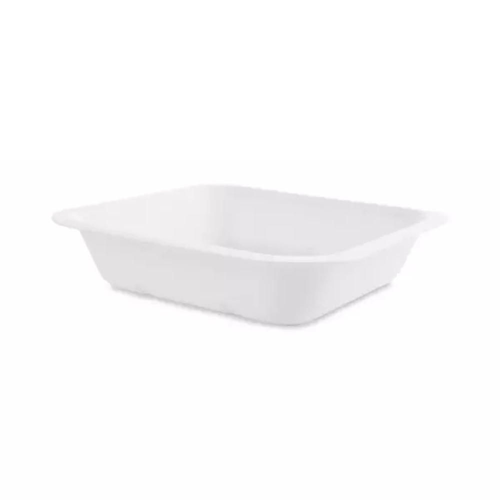 Versatile tray base for food to go. Part of Vegware’s Gourmet range, size 4. Multiple lid options. Space efficient stacking. Great for hot or cold, and sturdy enough to load up with food. Ideal for street food and festivals. This moulded fibre product uses reclaimed natural material such as sugarcane, bamboo or wood pulp. Stylish white. Award-winning quality by Vegware, made from plants. Made from recyclable materials.