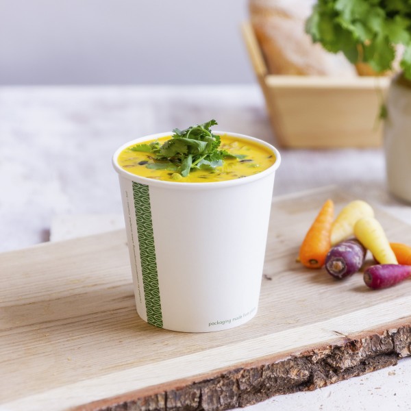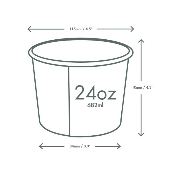 Versatile, leak-proof, sturdy round tub. Fits Vegware’s 115-Series lids. For hot soups, pasta, noodles, porridge or one-pot meals, or for cold salads or ice cream. Sustainably-sourced board with a plant-based PLA lining. Crisp white, with Vegware messaging in green. Award-winning quality by Vegware, made from plants. Designed for industrial composting, made from recyclable materials.