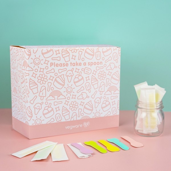 Inject some fun into your foodservice with our tutti frutti ice cream spoons. Perfect for ice cream, sorbets, yoghurts and more. Sustainably-sourced paper, pressed into shape with a water-based coating with a paper wrap. Each pack contains all colours: pink, purple, blue, green and yellow. Rounded edges for a superior eating experience with Vegware embossing on the handle. Award-winning quality by Vegware, made from plants. Designed for industrial composting, made from recyclable materials.