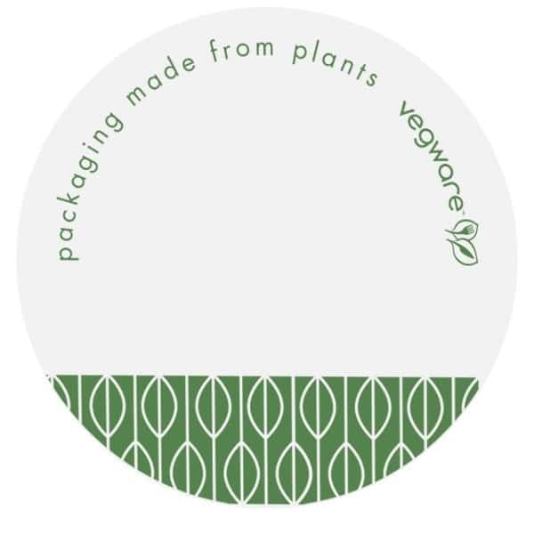 A 45mm round sticker with space for your writing. Great for sealing bags or paper wraps. Made from paper with a compostable adhesive. White with a stylish green design. Award-winning quality by Vegware, made from plants. Commercially compostable where accepted.