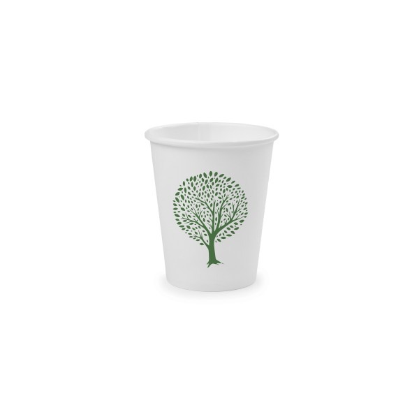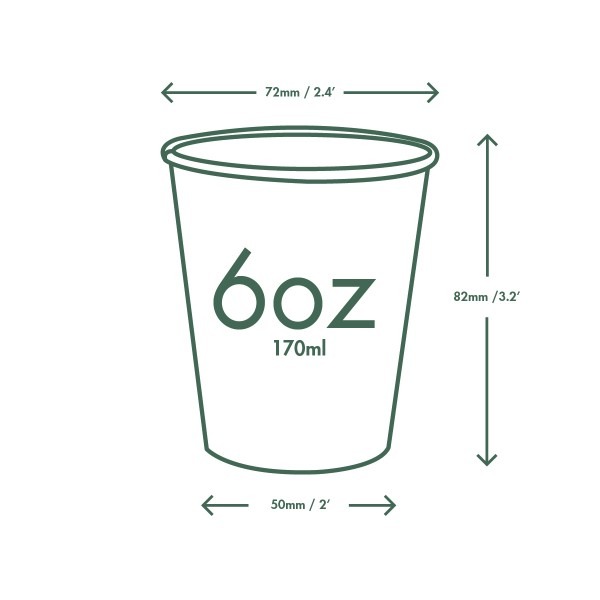 A home compostable 6oz single wall hot cup in our revamped Green Tree design! Fits Vegware’s 79-Series lids. For espresso or small speciality coffee, hot dipping sauces and any hot sampling. Sustainably-sourced board, lined with a water based lining. Crisp white board with tree in Vegware green. Award-winning quality, made from plants. Designed for home or industrial composting, recyclable in coffee cup recycling schemes – check your local options.