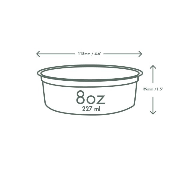 Versatile round deli container. One flat lid fits all sizes, for a great seal and easy stacking. A small portion of cold deli counter treats, cold snacks, or a delicious yoghurt dessert. Made from PLA, a renewable material made from plants. Clear for visibility. Award-winning quality by Vegware, made from plants. Commercially compostable where accepted.