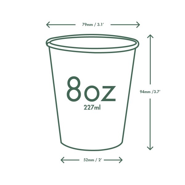 A home compostable 8oz single wall hot cup in our revamped Green Tree design! Fits Vegware’s 79-Series lids. The perfect number for your takeaway flat white. Sustainably-sourced board, lined with a water based lining. Crisp white board with tree in Vegware green. Award-winning quality, made from plants. Designed for home or industrial composting, recyclable in coffee cup recycling schemes – check your local options.