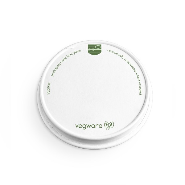 Paper lids for 90-Series soup containers. Great for hot or cold foods to go. Crisp white design with Vegware’s Green Leaf band. Made from sustainably sourced paper lined with plant-based PLA. Award-winning quality by Vegware, made from plants. Designed for industrial composting, made from recyclable materials.