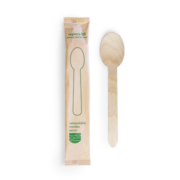 Sturdy wooden spoon, wrapped in matt kraft paper. Great for hot or cold foods, and sturdy and strong enough to set into crunchy meals. Excellent for takeaway foodservice. Rustic style made from renewable birchwood. Award-winning quality by Vegware, made from plants. Commercially compostable where accepted.