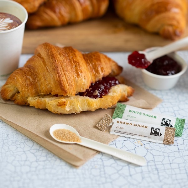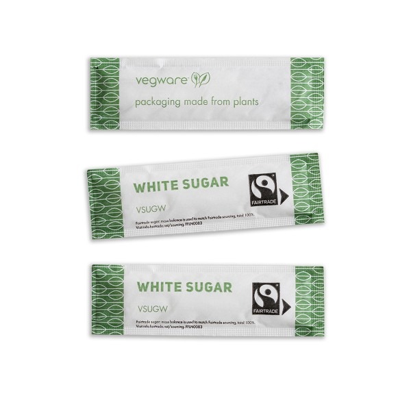 White Fairtrade sugar wrapped in the first compostable wrap. Simply tear and add the sugar to your hot drink. Suitable for paper recycling or commercial composting. Sustainably-sourced paper with a plant-based coating to seal the sugar in. Stylish green and white Vegware design. Award-winning quality by Vegware, made from plants. Designed for industrial composting, made from recyclable materials.