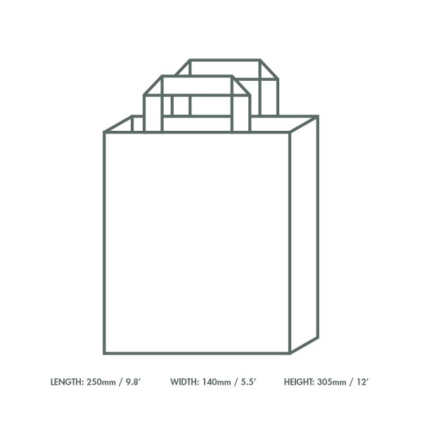 Sturdy recycled paper carrier bag with internal tape handles. Ideal for food to go. 100% recycled unbleached paper. Brown kraft colour. Award-winning quality by Vegware, made from plants. Designed for industrial composting, made from recyclable materials.