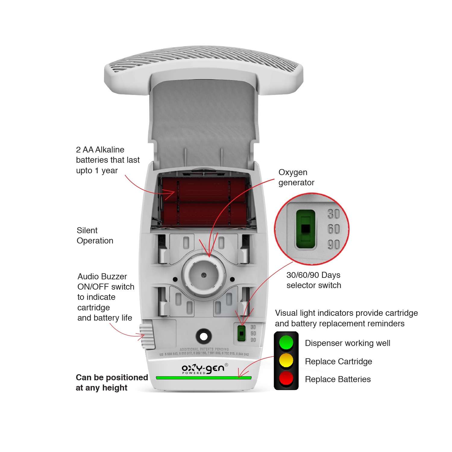• No batteries required – Operates without power for easy placement • Programme settings:- • 30 days for high intensity • 60 days for normal intensity • 90 days for low intensity • Oxygen-Pro cartridge fragrances (sold separately) are available in Glow / Adore / Spa • Dimensions: 12 x 10 x 14cm