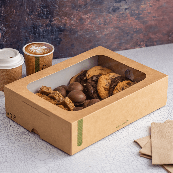 Kraft board platter box now consisting of a window lid and quick-fold inner base. Perfect for outside catering and events. Inserts are available to divide into smaller sections. Has a generous window for great presentation. ‘Regular’ is half the size of our ‘large’ platter box. Great for sandwiches, cold finger foods, tray bakes, and sliced fruit. Sustainably-sourced board with PLA window – a renewable material made from plants. Brown kraft colour with Vegware messaging in green. Award-winning quality by Vegware, made from plants. Commercially compostable where accepted.