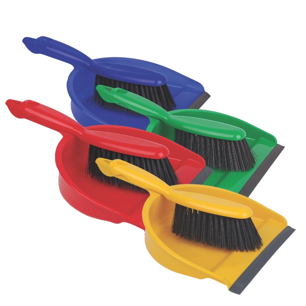 A professional quality dustpan and brush set with soft bristles, made from tough, hardwearing plastic. The dustpan has a rubber lip at the front for better dirt collection.