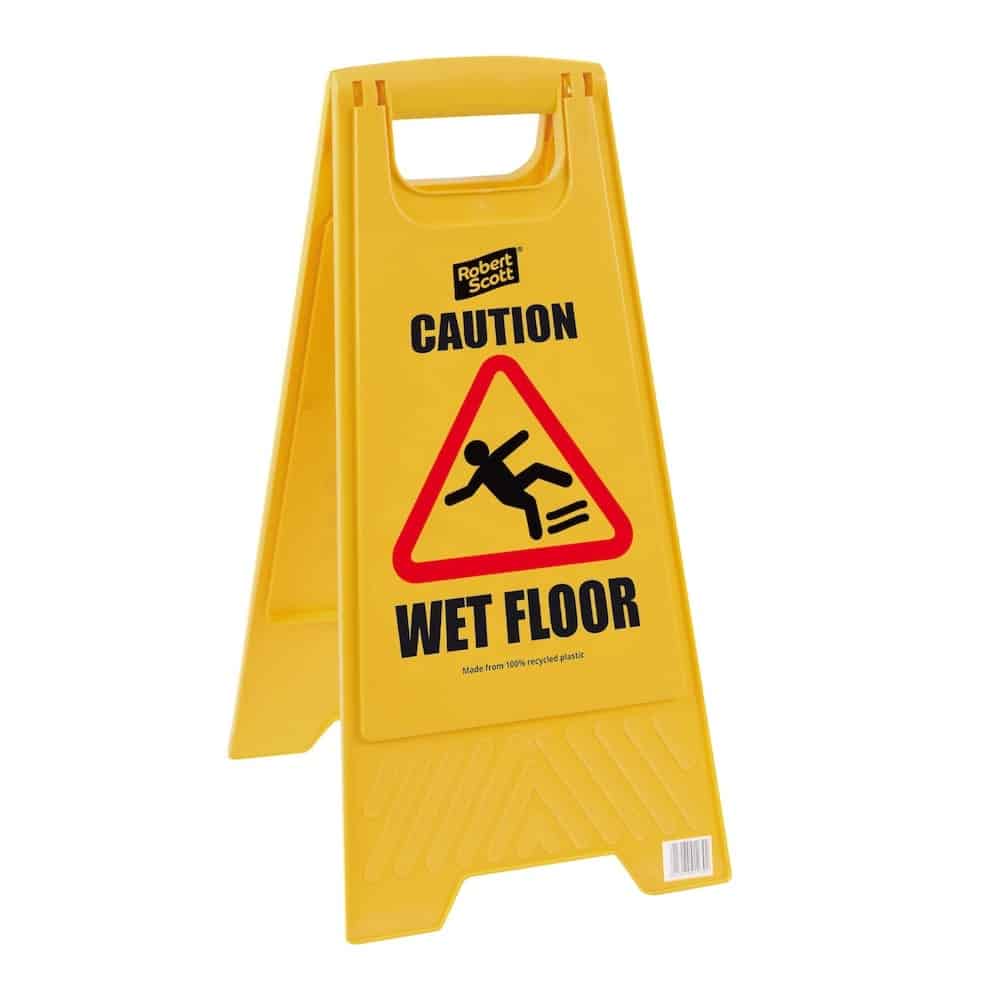 A great value double sided A frame sign to warn against potential hazards from wet floor surfaces during and after cleaning or spillages. Made from vivid yellow plastic with bright red/black graphics. No assembly needed, folds flat for easy storage.